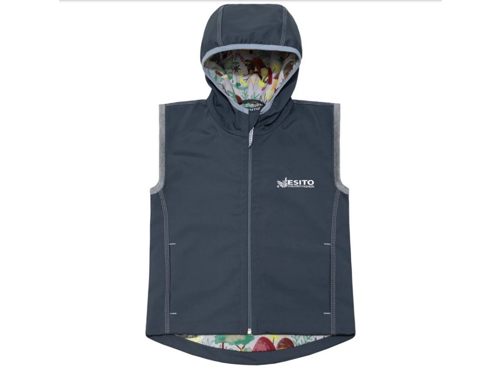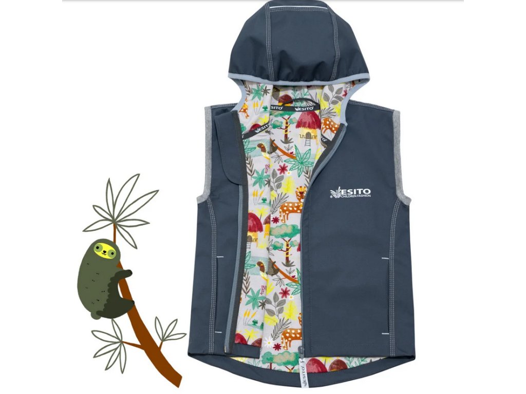 Vesta má dvojitou podšívku z měkoučké bavlny s elastanem a roztomilým neutrálním potiskem Keňa a zvířátek, který si kluci i holky zamilují na první pohled.