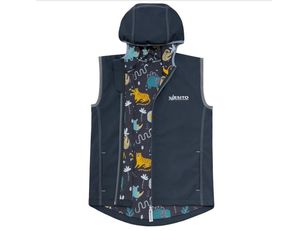 Vesta má dvojitou podšívku z měkoučké bavlny s elastanem a roztomilým neutrálním potiskem safari zvířátek, který si kluci i holky zamilují na první pohled.
