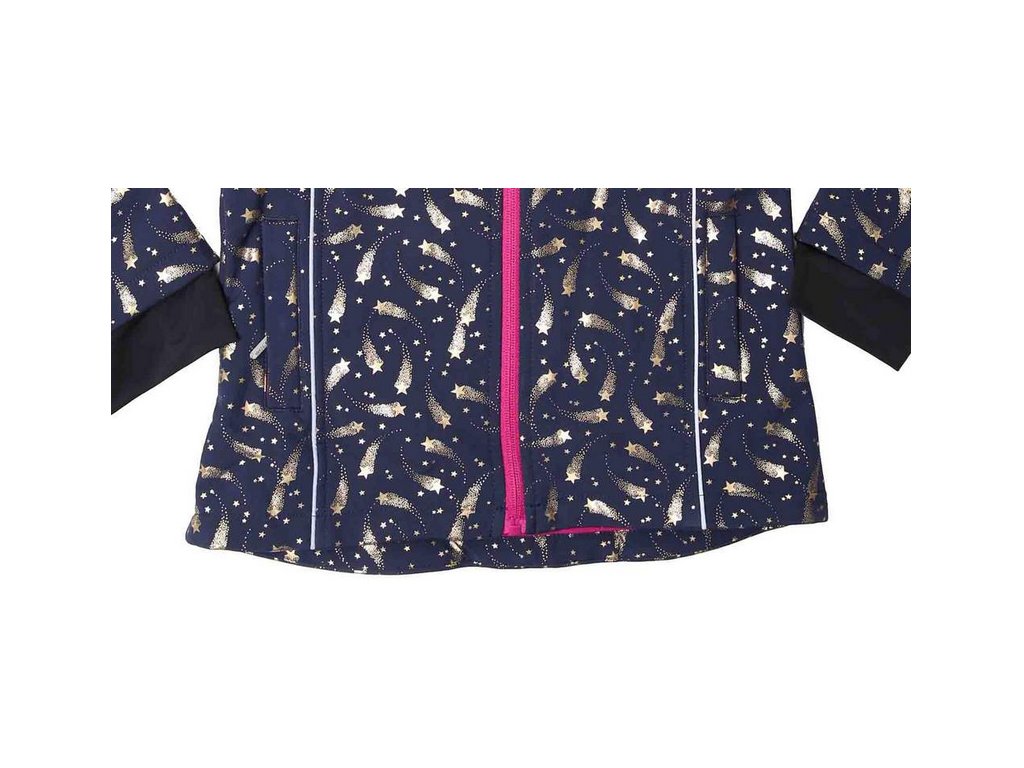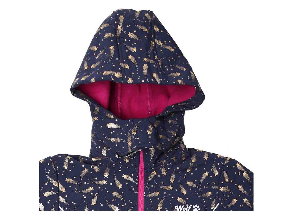 Velmi povedená dívčí softshellová bunda Wolf s fleecem na vnitřní straně je skvělou volbou na jaro i podzim. Zlaté komety na bundě jsou v reálu o dost krásnější než na fotce.